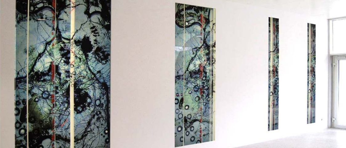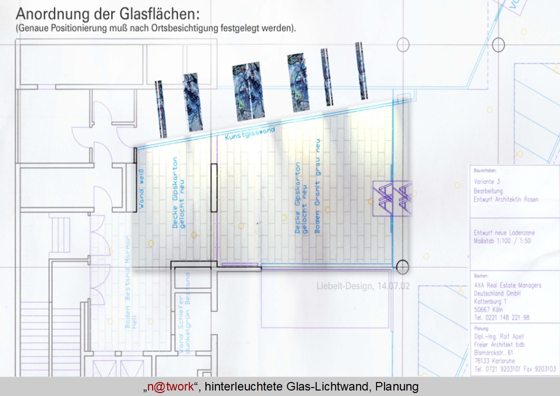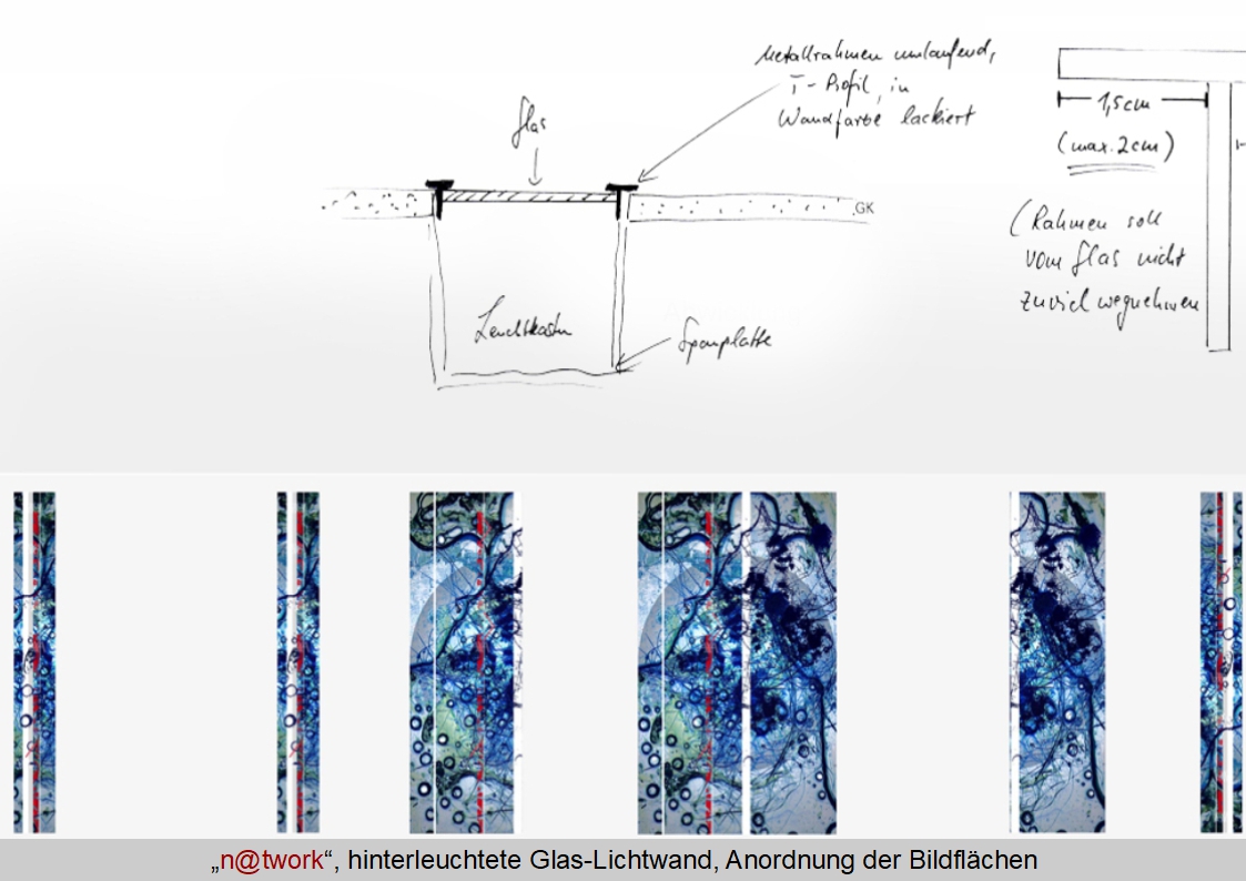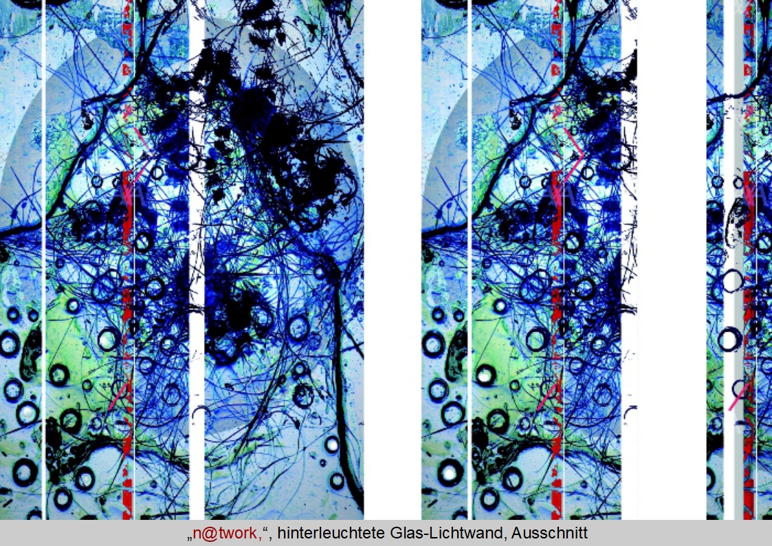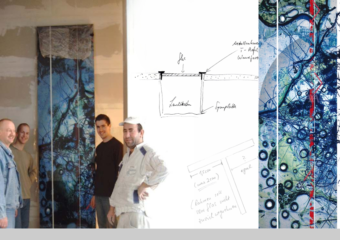 - Technik: co-co-painting im Glas. Entwickelt wurde eine Glaskunst, deren Glasflächen bündig zur Wand eingesetzt wurden (ca. 15 m).
